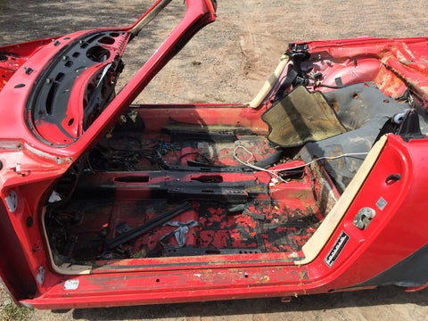 911 Body shell Cabrio Guards Red 1987 with wiring harness has fresh air - fuse box - master cylinder - a/c intact in smuggler's box. CUT IN HALF.
